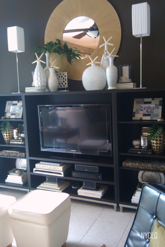 Some starfish I used in my relocated Tiffany bowl. The bowl was a gift from our Realtor when we had bought this place in 2006. The blue beach glass stones are from Ikea (3 years ago). I like the way they picked up on the two colored books I brought down from the office. Jeff LOVES to fish, so the painted white wood carved fish is a nod to his hobby (from HomeGoods 2007) The Grapewood branch I picked up at HomeGoods during "Buy Made In America Week" earlier this year. It's from California and I like the organic addition to the coffee table-scape. The white ceramic pillar holders I had gotten on clearance at JCP back in '08. Someone had returned them so I scooped the up at a steal for only $2 & $3 (I LOVE a bargain!)