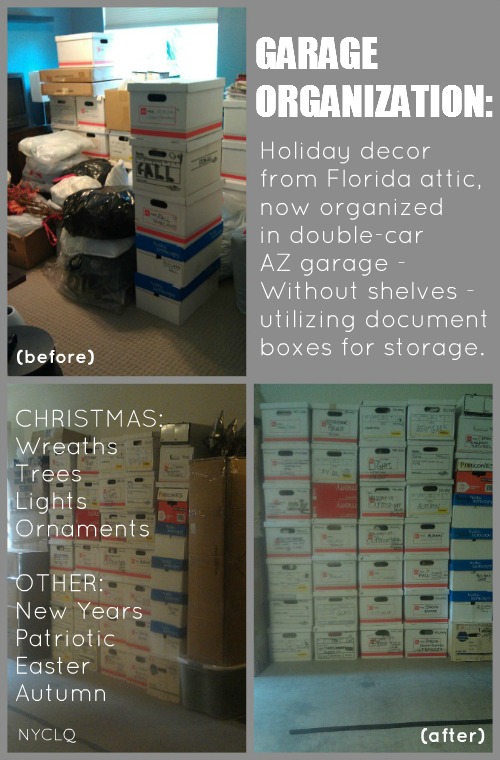 Yes - it's really nice to go out and buy all the color coordinated tubs & bins for garage storage and organization, but sometimes you just need to make do with what you have. Not being able to run out to the Container Store or Target for colorful bins doesn't mean a garage can't still be organized. Just like I do in our home: re-purposing items I already have (like a damaged office bookcase now a garage paint supply area), just keeping like items together & labeled can make a difference in a garage space. Our garage in Florida was a single car garage. Now we have a 2 car garage. In Florida, I used the attic for holiday decor storage. Here in AZ, I wouldn't DARE put a THING in these attics!! So our holiday decor is now stored in the garage. I'd love to paint - but since we're renting, this is one space the paint can pass by. We had thankfully removed some of the shelving when we moved. It came in handy when setting up shop & decor storage here. But even when no shelving is available, just keeping boxes the same size (and labeled) can be a huge help! Here are some tips from how I've organized our garage...